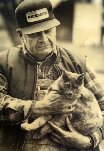 This photograph of a local resident holding Kitty Kat, taken in the mid-1980s, is displayed in the foyer of Tangent City Hall. The man holding Kitty Kat is not John Bass — it's the caretaker hired by the estate to take care of the furry landlord. (Photo: City of Tangent)