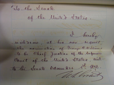 The letter, signed by President U.S. Grant, asking the U.S. Senate to