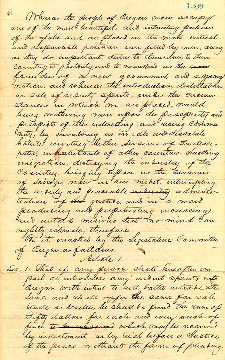 “WHEREAS THE PEOPLE of Oregon now occupy one of the most beautiful and interesting portions of the globe,” they wrote turgidly, “and are placed in the most critical and responsible position ever filled by men, having as they do important duties to themselves, to their century, to posterity and to mankind, as the founders of a new government and a young nation; and WHEREAS the introduction, distillation, or sale of ardent spirits, under the circumstances in which we are placed, would bring withering ruin upon the prosperity and prospects of this interesting and rising community, by involving us in idle and dissolute habits, inviting hither swarms of the dissipated inhabitants of other countries, cluttering emigration, destroying the industry of the country, bringing upon us the swarms of savages now in our midst, interrupting the orderly and peaceable administration of justice, and in a word producing and perpetrating increasing and untoward miseries that no mind can rightly estimate; THEREFORE be it enacted by the Legislative Committee of Oregon as follows ….”
