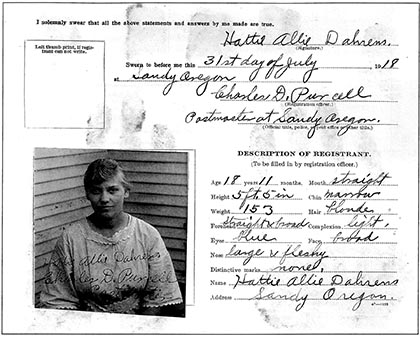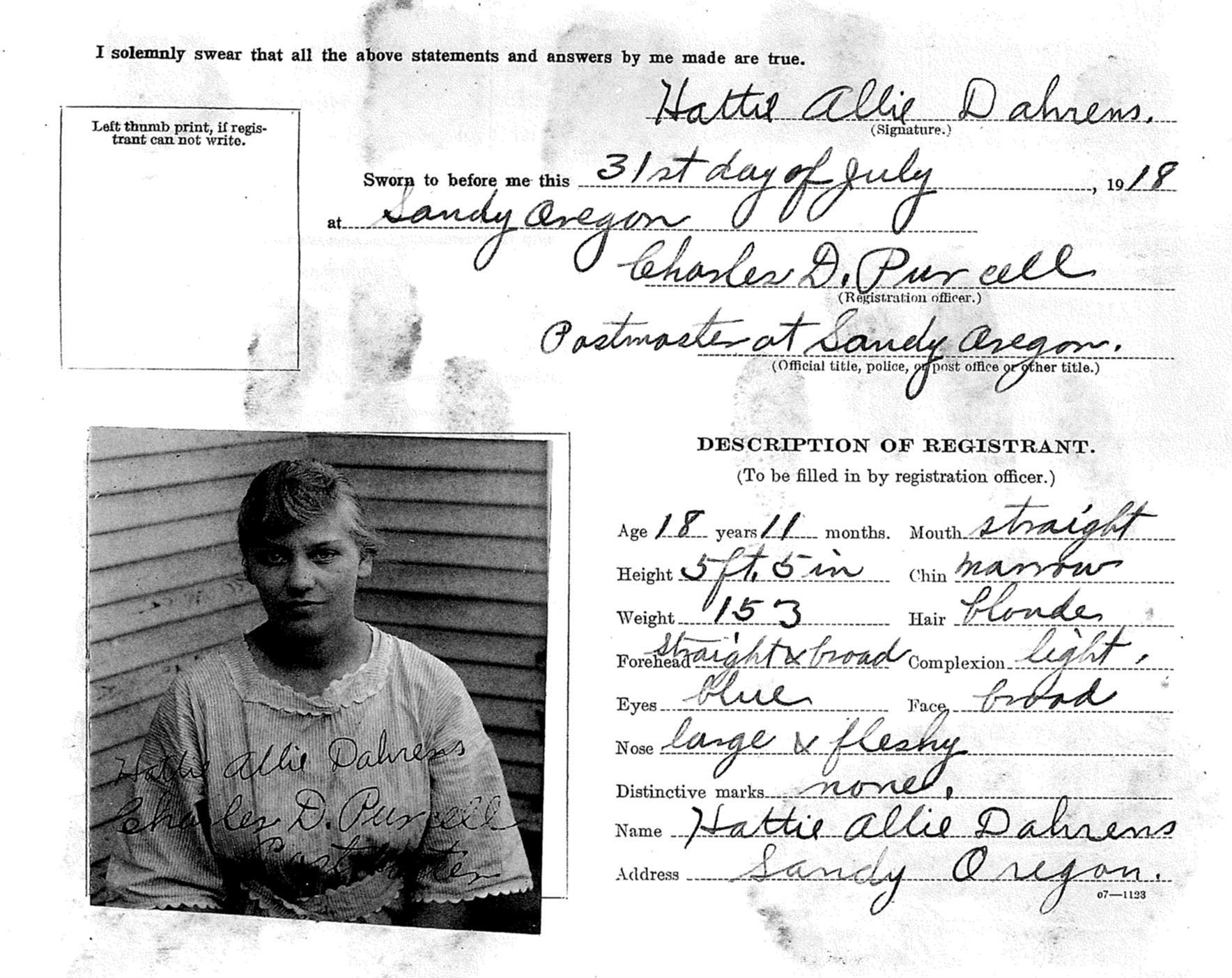 HATTIE BURBANK WAS one such “enemy alien.” Born and raised in Sherwood, she was a second-generation Oregonian in love with a German-born logger named Adolph Dahrens. Adolph had, in 1916, started the process of applying for naturalization, and in June 1917 – two months after America entered the war – he registered for the draft, offering his services to the American army for purposes of fighting against his fellow Germans.
