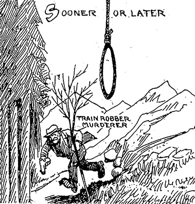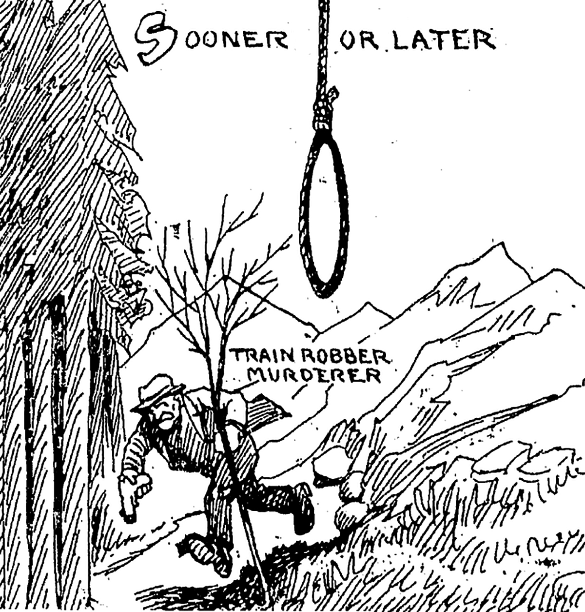 THE HEIST STARTED at the summit of the Siskiyous, as the train crossed the border into Oregon. It had to slow at the summit for a brake check just before going into a long tunnel — Tunnel 13, coincidentally enough — and when it did, Roy and Hugh jumped aboard the engine. Wasting no time, they leveled their weapons — a sawed-off shotgun for Roy and a .45 automatic for Hugh — and ordered the engineer, Sydney Bates, to stop the train right at the end of the tunnel. This was, it seems, to prevent passengers from seeing what was going on. (Ironically and tragically, it was to be Bates’ last day on the job; he was scheduled to start his retirement the very next day.) Once the train was stopped, the brothers were joined by Ray, who had been waiting at the end of the tunnel with a box of dynamite stolen from a mining operation, just in case it might be needed to open the mail car. As it turned out, it was needed for that. The mail clerk, when he saw what was happening, barricaded himself inside the car and refused to open the door; so the brothers packed dynamite around the door and touched it off. Unfortunately they had no idea what they were doing. The amount of dynamite they used wrecked the end of the car, filled it with smoke, and instantly killed the mail clerk, Elvyn Daugherty. And although they were now able to get in, it didn’t do them much good; there was mail scattered everywhere, they couldn’t see through the smoke, and the fire was spreading quickly. Back in the train, of course, the passengers were starting to panic. The train had stopped suddenly while they were still in the tunnel; then a huge explosion had rocked the car and probably broken out some windows, and the tunnel had started to fill with smoke and fumes. They were trapped in the tunnel like rats. One of the train’s brakemen, C. Coyle Johnson, started fighting his way through the smoke and flames to the front, trying to find out what was wrong. Unfortunately for him, he made it. Emerging from the fiery tunnel mouth, he startled the robbers, who wheeled and opened fire on him. Down he went, dead. At this point, the brothers apparently switched their plan from “salvage something from this mess” to “escape at all costs.” They ordered engineer Bates and fireman Marvin Seng to uncouple the engine from the mail car, apparently planning to have the engine take them down the mountain away from the scene of the crime; but the explosion had damaged the couplers, so it could not be done. So the brothers simply gunned the two survivors down in cold blood. Sydney Bates and Marvin Seng were simply shot in the head as they stood there with their arms in the air, because the brothers wanted no witnesses left on the scene. And then they ran, dragging creosote-soaked sacks behind them to fool the bloodhounds.