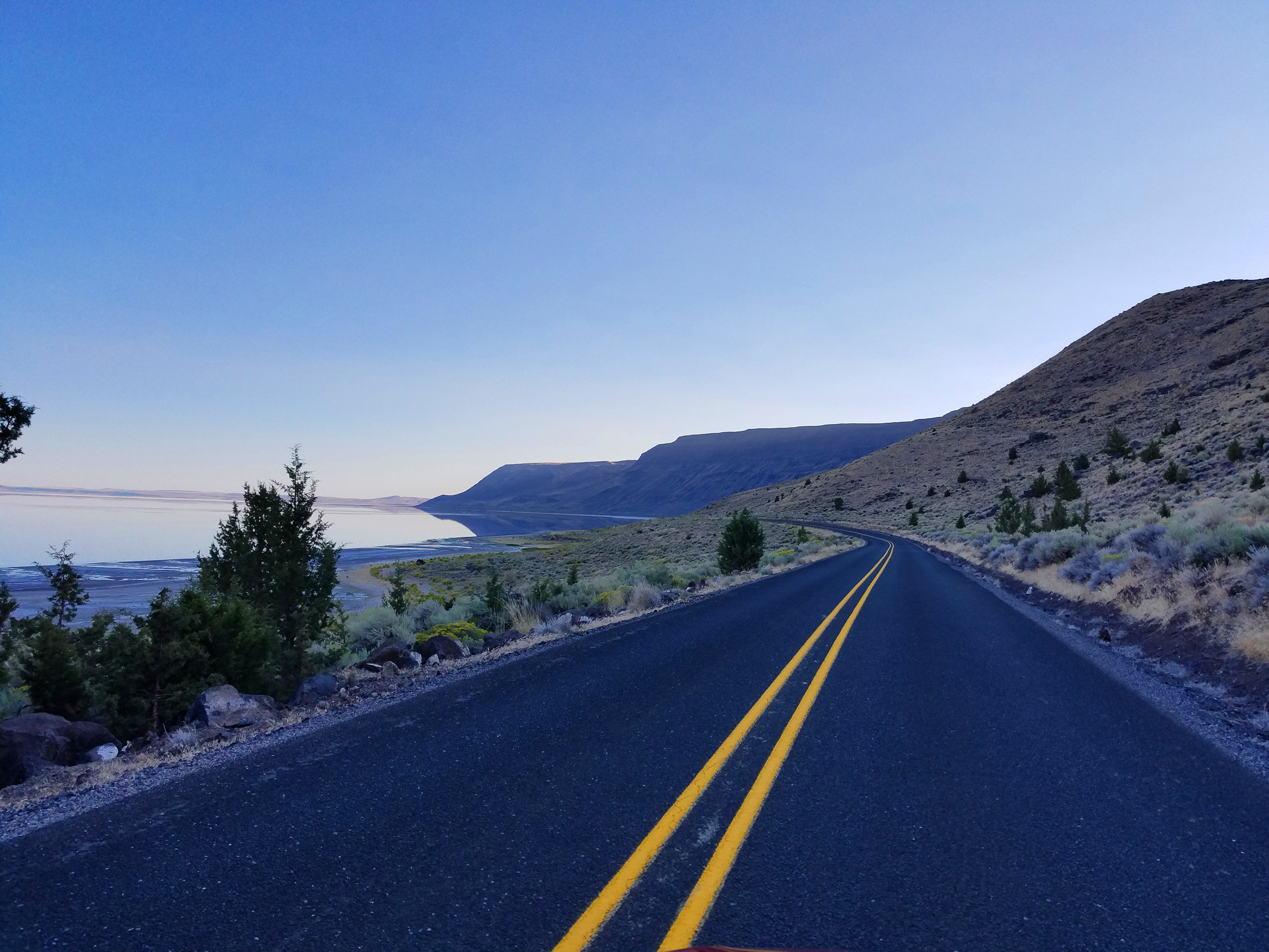 Background photo is an image of Highway 395 on the shores of Abert Lake, made by F.J.D. John in 2016.