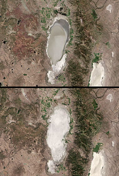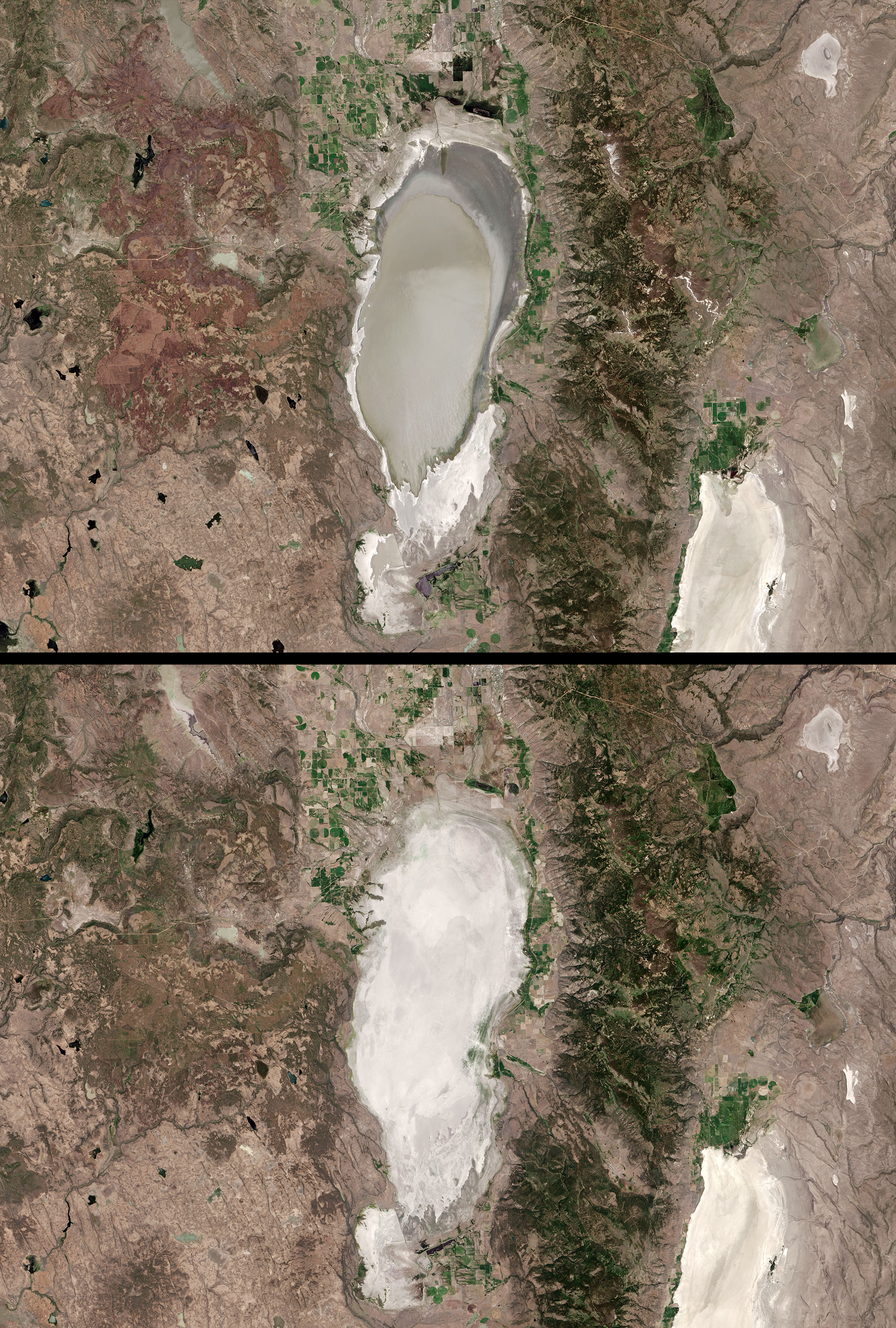 Photographs from NASA’s Landsat 8 satellite show Goose Lake partly full of water, in 2013, above; and dry and empty, as it appeared in 2015. (The smaller dry lake to the right of Goose Lake is Alkali Lake, and the streets of Lakeview can be seen at the top of the frame.) (Image: NASA)