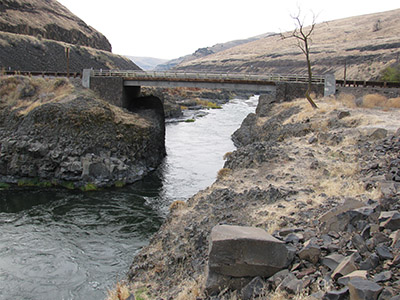 At the spot in the Deschutes River where this bridge is today, members of Stephen Meek’s wagon train built a pulley system to get people and wagons across the river. (Image: Image: Lostwagonman/ Wikimedia)