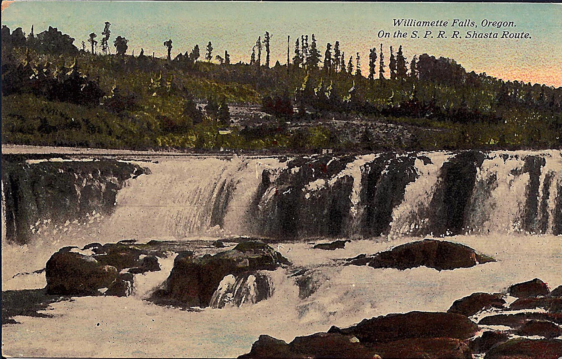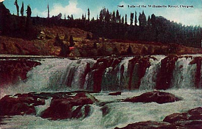 Willamette Falls as it appeared around the turn of the 20th century. In 1860, when the Hay Burner was allowed to go over it, the falls would have looked much like this, although the land in the background would have been covered with old-growth timber. (Image: Postcard)
