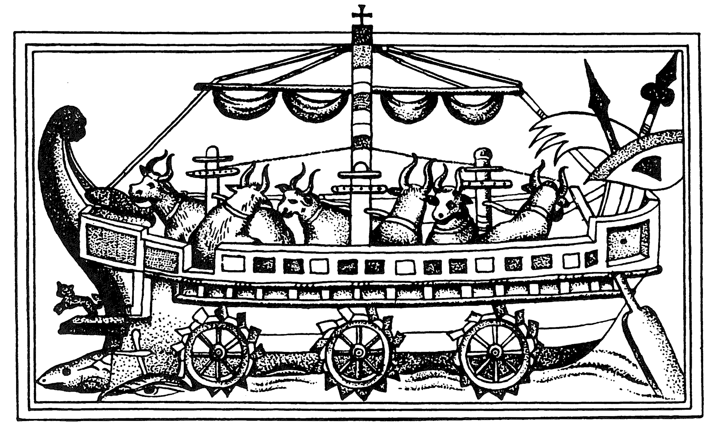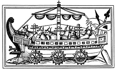 An ancient Roman drawing of a cattle-powered sidewheel war galley. (Image: Smithsonian Press)