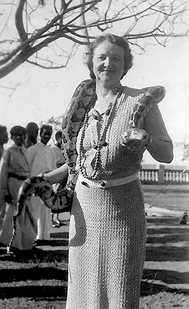 Mona Bell poses for a photograph with a giant snake during a world tour in 1935. (Image: findagrave.com)
