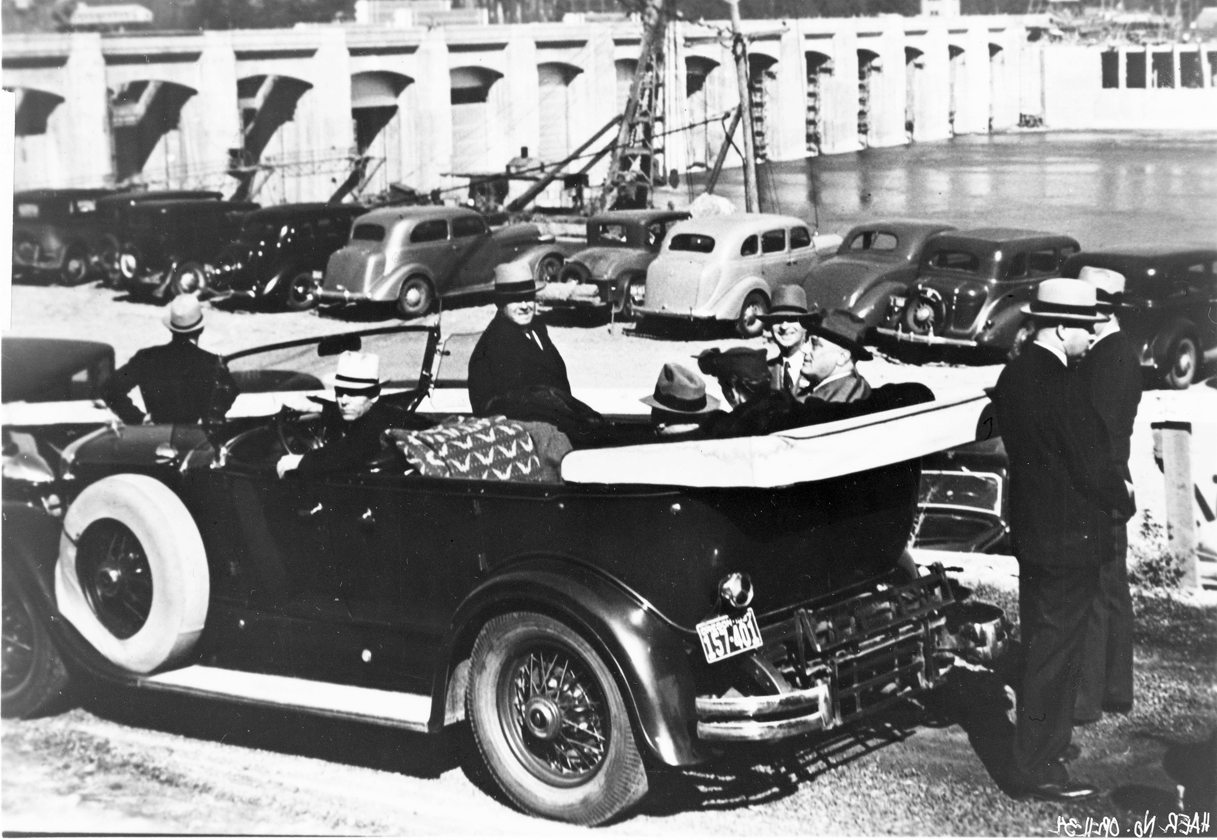 President Franklin Roosevelt arrives to inspect the Bonneville Dam upon its opening in 1937. Mona Bell hated Roosevelt, blaming him for the taking of her property to make way for the dam. (Image: Library of Congress)