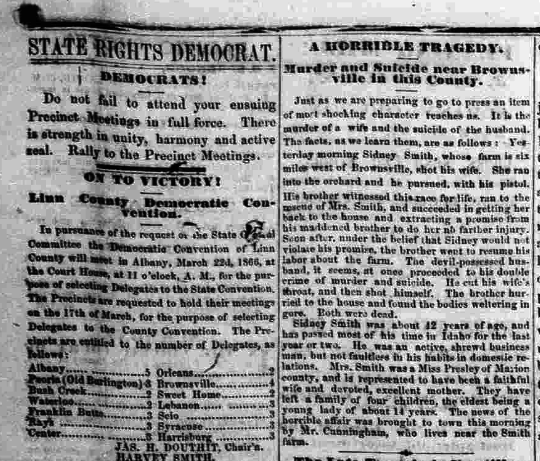 Early coverage of the Sidney and Barbara Smith murders in the Albany State Rights Democrat took Sidney’s brother Thomas at his word. By the following week’s issue, though, the story had changed. (Image: UO Libraries)
