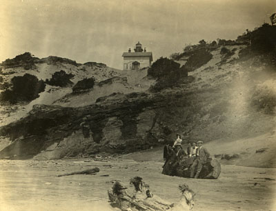 This image of turn-of-the-century beachgoers on the dry sands of the beach at Newport around 1905 shows the lighthouse above, by then long since abandoned and more than a little eerie-looking. (Image: Oregon State University Archives)