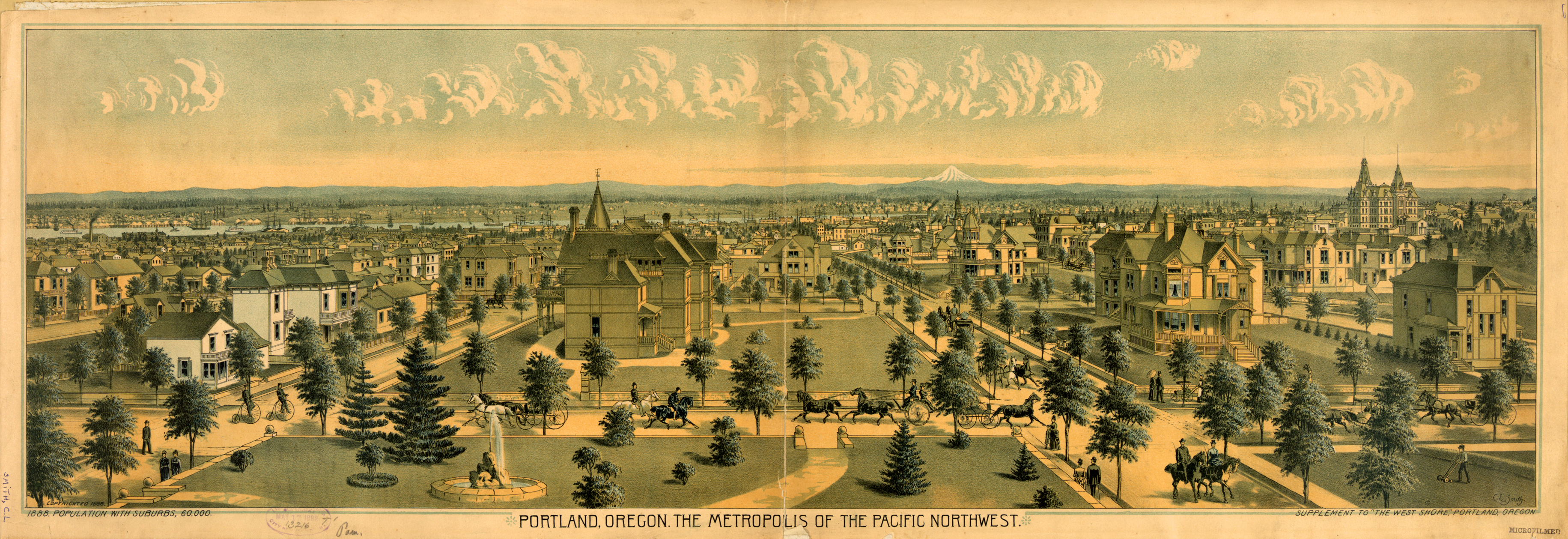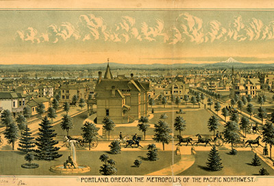 This panoramic lithograph shows the city of Portland as it appeared around the time of John W. Murray’s shotgun murder of his brother-in-law. It was published in an 1888 edition of The West Shore magazine. (Image: UO Libraries)