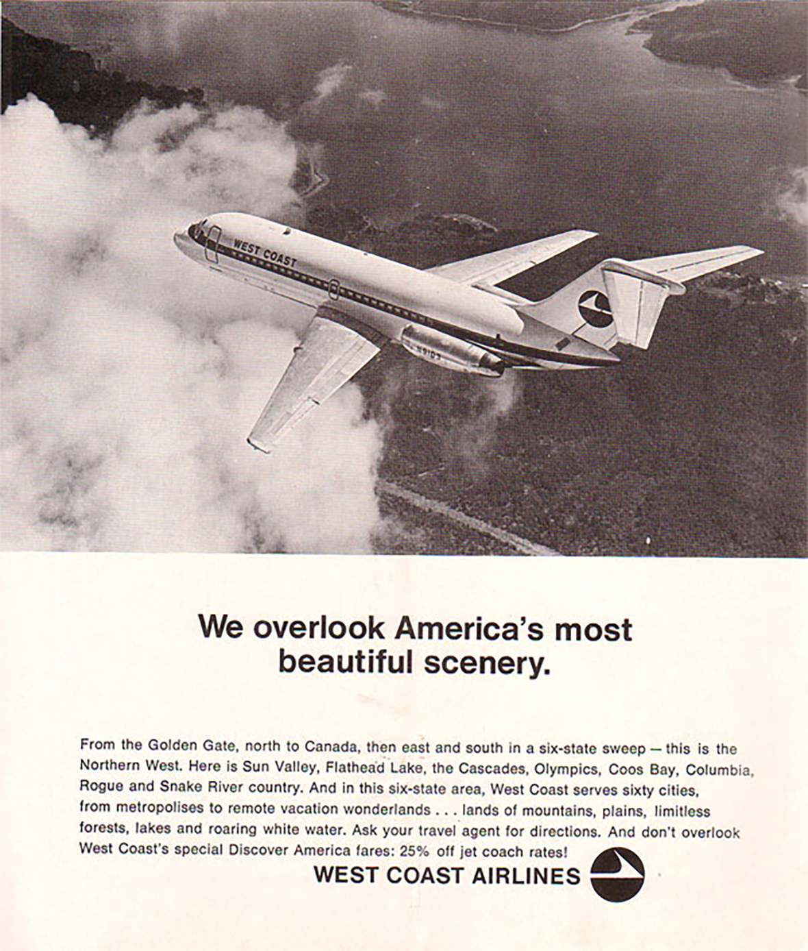 This magazine ad for West Coast Airlines, in the late 1960s, proudly showcases the then-new DC-9 flagships. (Image: vintageairliners.com)