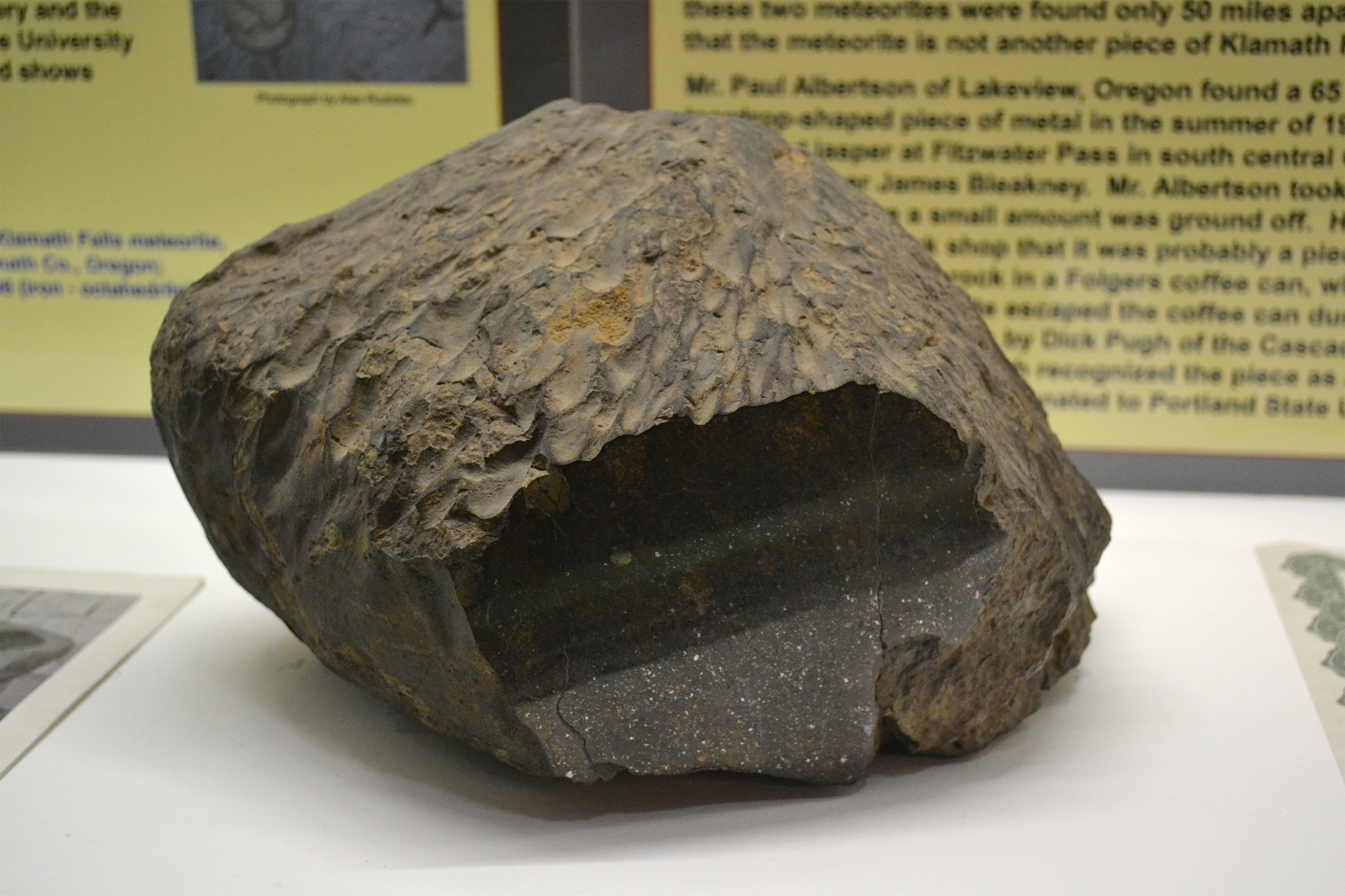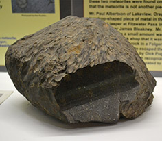 The big Sams Valley chunk, the 15-pounder, got sold to a commercial dealer, which cut it into bits to sell to museums and private collectors. The piece found in 1938 got forwarded to University of Oregon astronomer J.H. Pruett, who agreed to slice the thing up in exchange for a one-pound piece. He did this (or, rather, his friend C.A. Coulter and Coulter’s teenage son Donald did — by hand! It took them 11 hours and 18 hacksaw blades) and his one-pound piece is now on display at the Oregon Museum of Natural History in Eugene. Klamath Falls Meteorite: Klamath County, 1952: This meteorite was found somewhere in Klamath County, and it was a very large one — 38 pounds. The person who found it brought it to a meteorite expert and dropped it off for testing, but never returned to pick it up — so its origins are shrouded in mystery. It was acquired by the University of New Mexico, and subsequently cut up so that pieces could be sold to private collectors and other museums. Salem Meteorite: Marion County; 1981: A little after 1 a.m. on May 13, 1981, Marion County Deputy Sheriff James Price was sitting on the curb in front of his residence talking with another deputy when both men heard what sounded like a shower of gravel hitting the roof. They investigated, using their flashlights, and eventually found a still-warm piece of stony meteorite that had hit the ground within 10 feet of them. The meteorite fragments were tested to confirm that they were of extraterrestrial origin and not just rocks from some neighbor kid’s slingshot. They turned out to be the real deal, and Deputy Price was no doubt happy to add them to his rock collection. Morrow County Meteorite, 1999: Washington residents Donald and Debbie Wesson were driving home from a visit in north central Oregon when they saw a particularly interesting rock lying in the ditch. It was about 40 pounds, uniquely shaped, as if it had been partly melted. On one side a piece had been torn away, probably by a farmer’s plow. Donald picked it up and took it home to add to his rock garden, where it remained for the next eight years. Then one day Donald watched a TV program about meteorites and it started him wondering if that weird rock he’d picked up in Oregon might be one. Asking around, he was directed to Dr. Dick Pugh at Portland State University, who, with the help of his colleagues at PSU’s Cascadia Meteorite Laboratory, was able to confirm it was a meteorite. As meteorites go, the rock is a pretty common type; but there are a few things about it that are unusual, according to Dr. Melida Hutson, curator of the Meteorite Lab. “It has beautiful shock veins and glass, caused by a major collision in space,” she said, in a 2010 press release. “And the cone shape of the meteorite is very nice for such a large specimen.” Fitzwater Pass Meteorite: Lake County; 1976: In the summer of 1976, Lakeview rockhound Paul Albertson was out hunting for agate and jasper with his high-school teacher, James Bleakney, when he found a strangely heavy teardrop-shaped piece of metal the size of his thumb. Albertson took the 2.3-ounce chunk to his local rock shop, where the staff members were stumped, but told him it was probably a piece of nickel ore. Albertson took it home and stashed it in a coffee can with some other interesting rocks, and there it remained until one day Dr. Pugh of the Cascadia Meteorite Lab came to the Lakeview Public Library to give a lecture about meteorites. Albertson, remembering the weird bit of nickel ore he’d found when he was in high school, dug it out of the can and brought it with him. Dr. Pugh sent it in for analysis, which revealed that it was a very rare IIIF Iron meteorite. South Slough Meteorite story: Coos County; 1890: This meteorite, if it existed, has been lost. This would be very difficult to do, because the description that has come down to us is of a piece of space rock roughly 40 times bigger than Namibia’s Hoba Meteorite, the world’s largest authenticated meteorite. The story comes to us from Pioneer History of Coos and Curry Counties, a book by O. Dodge published in 1898 by the Capital Press in Salem. It’s probably best, as one of Raymond Chandler’s hard-drinking detective protagonists once put it, to take this shot straight from the bottle: