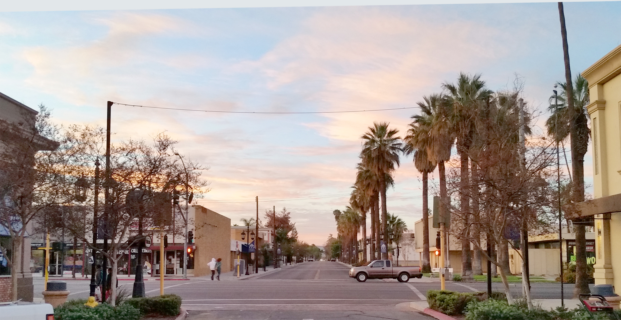 A sunrise scene in downtown Hemet, Calif., the desert town in which Carl Barks was living in 1960 when John Spicer’s fan letter arrived, bearing him the astonishing news that he was the most popular and respected comic-book artist in the world and had been for years. (Image: Thomas/Wikimedia)