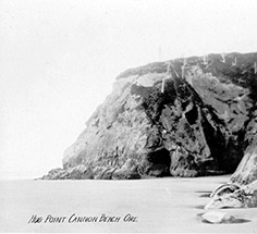 Hug Point as it appeared shortly after the road was cut across it, from a distance. The roadway can be seen at the bottom left, across the front of the headland. (Image: USFS)