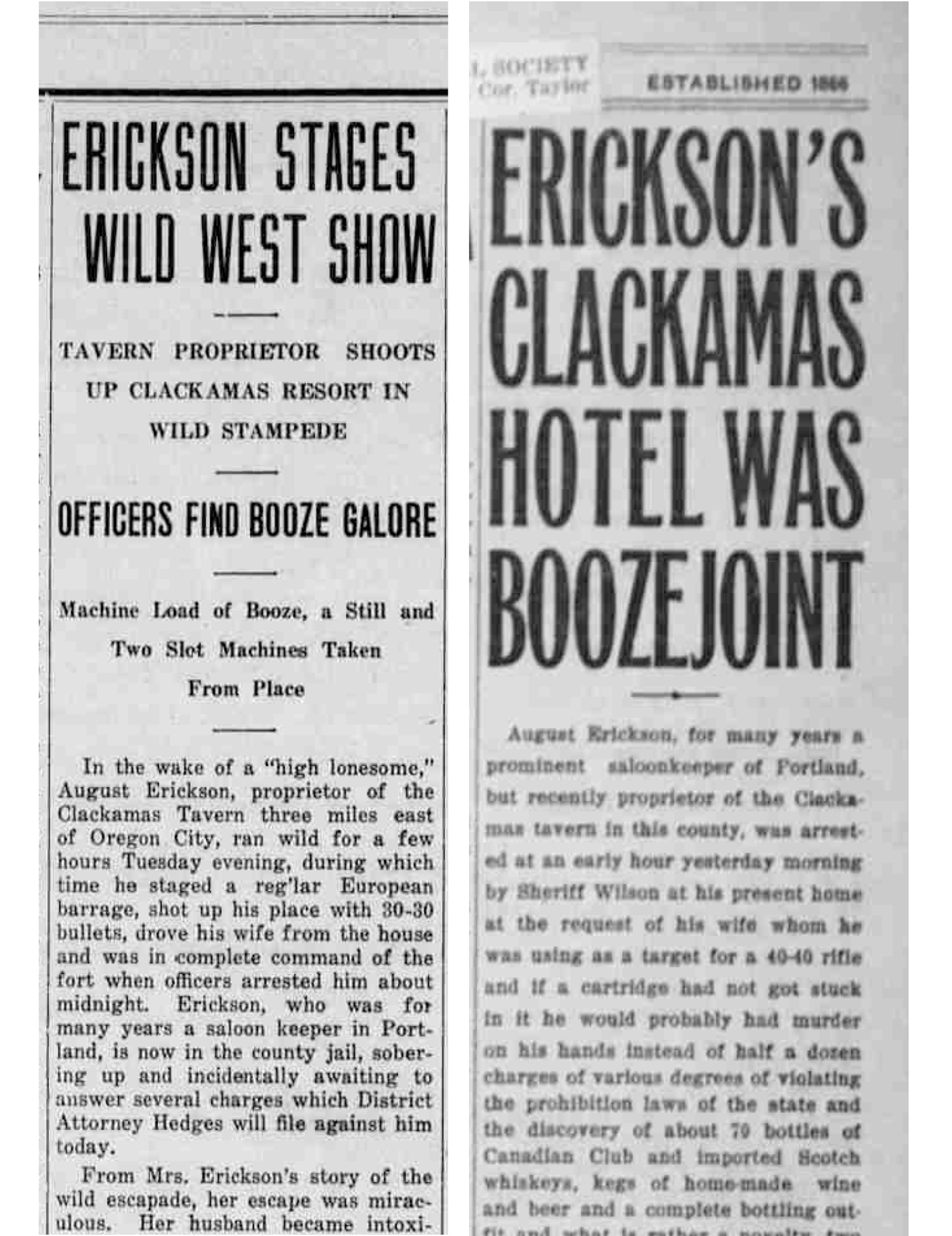 Both the Oregon City Courier (left) and Enterprise covered August Erickson’s arrest at the Clackamas Tavern on the front page, with large headlines. (Image: UO Libraries)