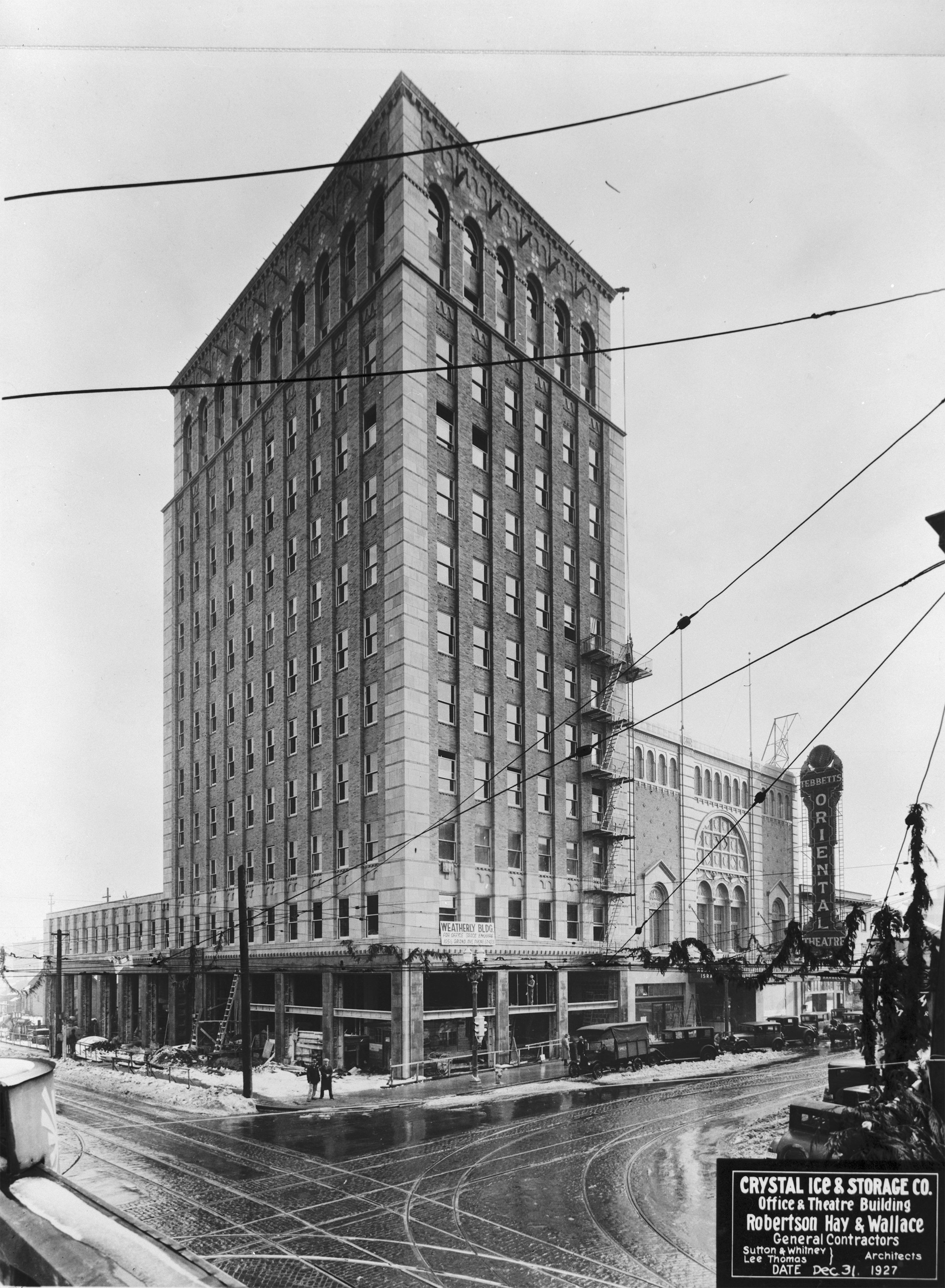 The Weatherly Building during the final phases of construction. The Oriental Theatre, which Weatherly also had built at the same time, opened on December 31, 1927, so this photo was taken on its opening day. The theatre has since been demolished, but the Weatherly Building remains an eastside landmark. (Image: National Parks Service)