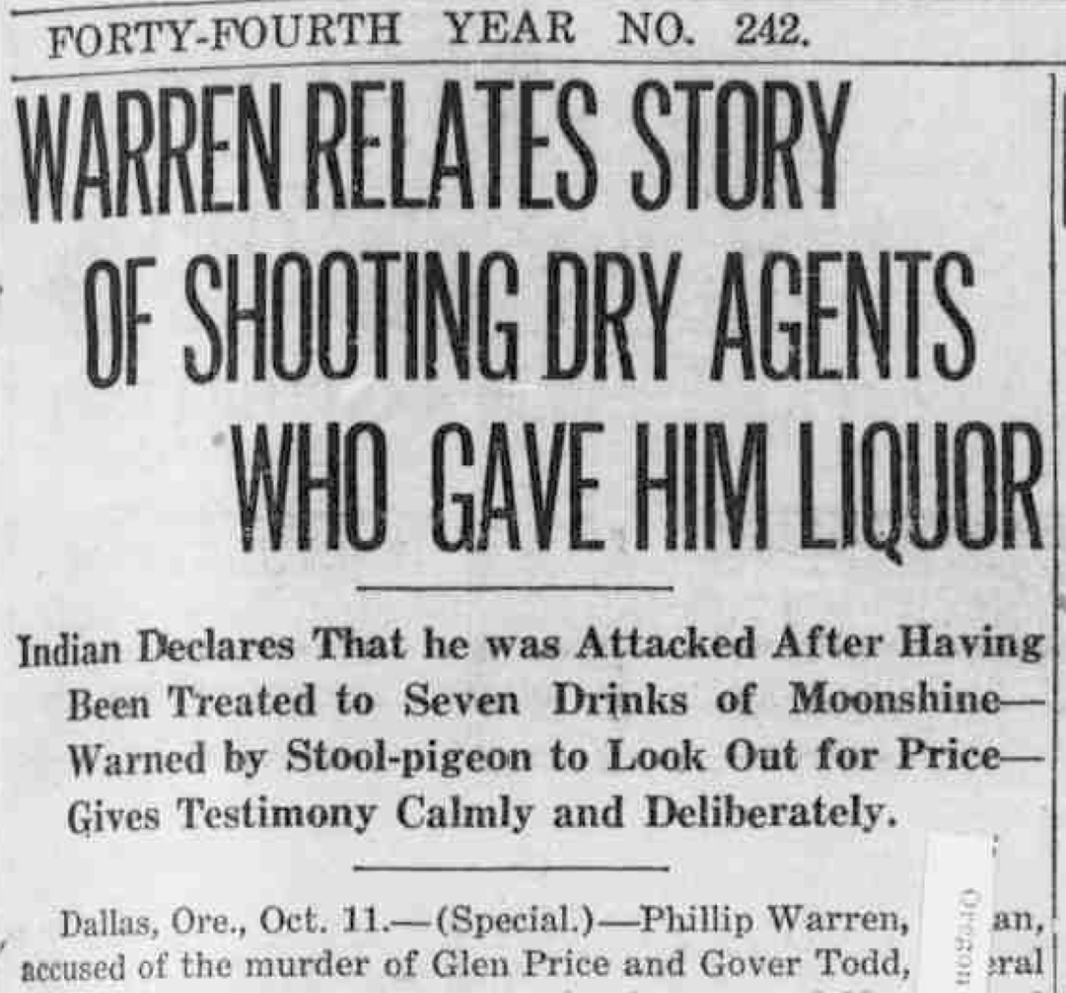 “Prohibition Agents Glenn H. Price and Grover Todd were attempting to arrest a bootlegger named Phillip Warren in Grand Ronde, Ore. Warren escaped, obtained a rifle, and killed both agents. Warren was later taken into custody and charged with murder under state law.”