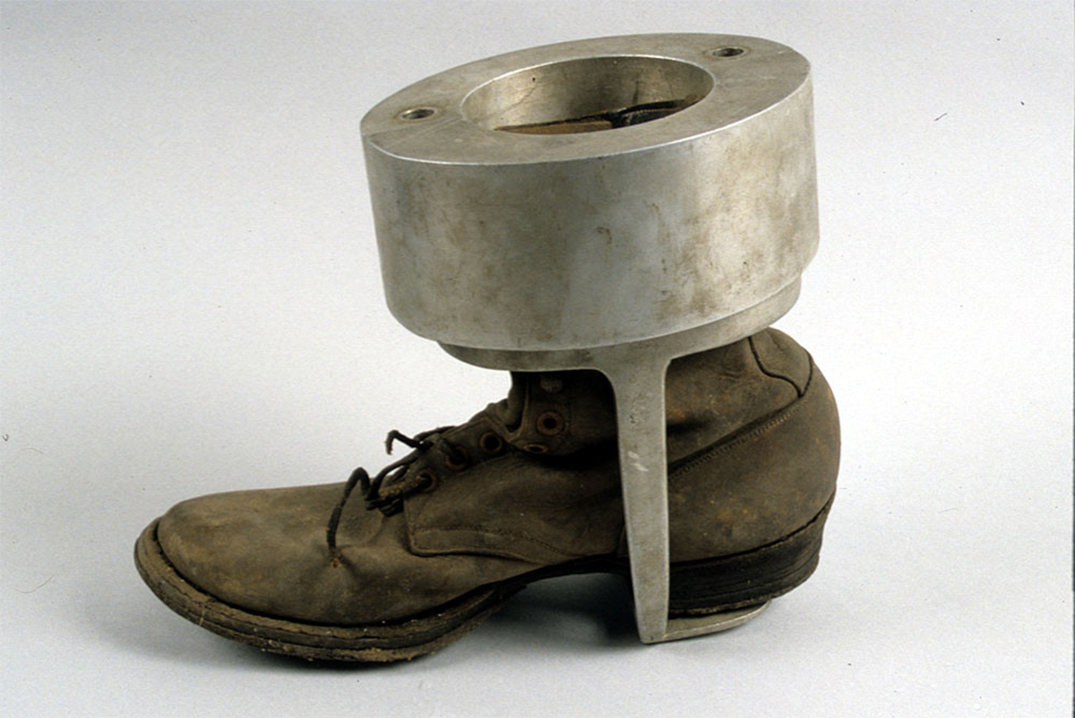 THE OREGON BOOT consisted of a heavy iron or lead band that locked around the prisoner’s ankle. To this band was welded or bolted a heavy iron support strap that attached to the heel of a heavy shoe or boot. The whole contraption weighed up to 28 pounds, and it was attached to only one leg, with the result that the prisoner was perpetually off balance. The idea was kind of like how farmers deal with chickens that learn to fly the coop: clipping the wing feathers on only one side. Like barnyard birds, jailbirds found it very hard to fly when asymmetrically hobbled like that.