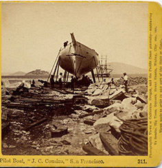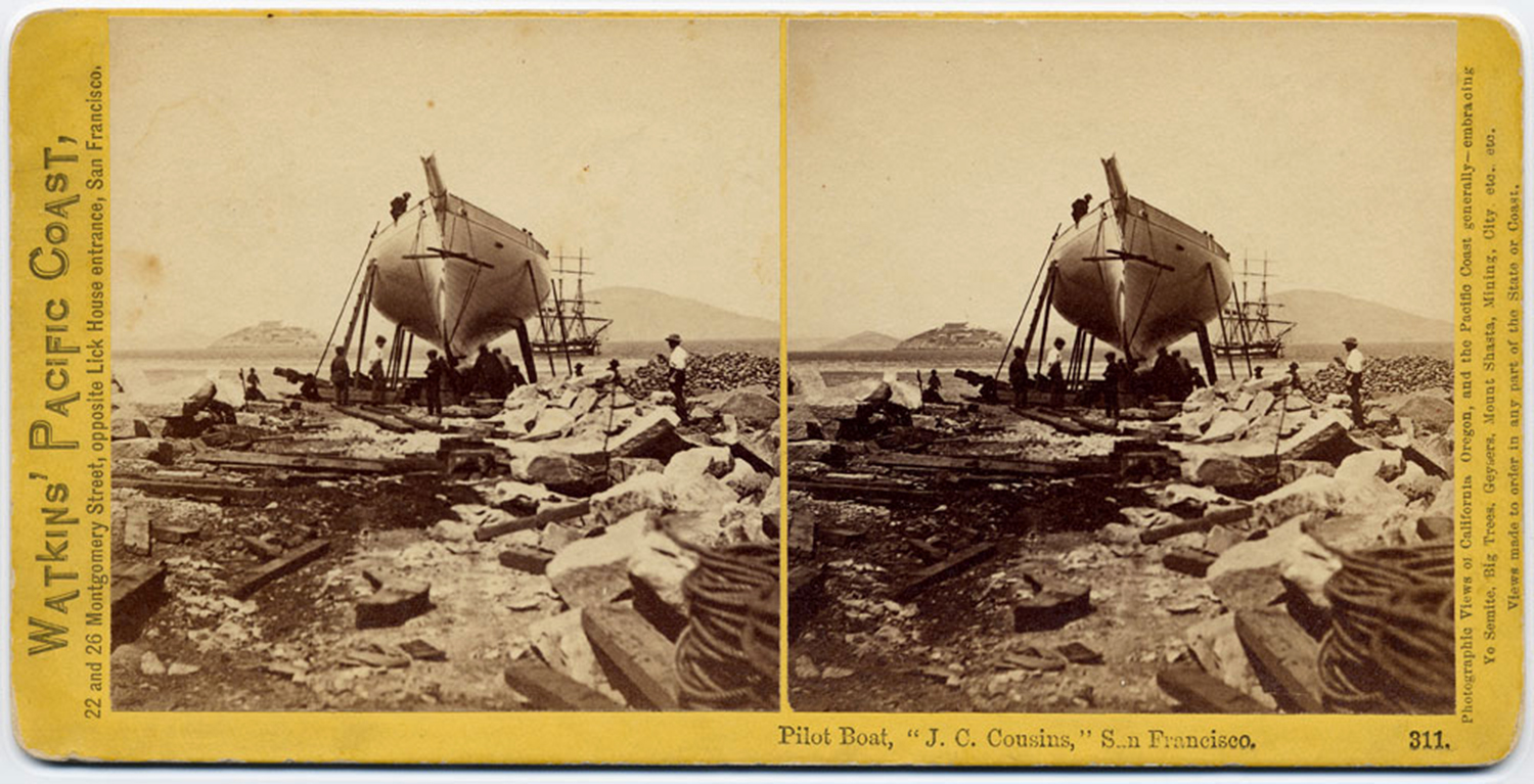 Another stereo slide view of the J.C. Cousins undergoing repairs in San