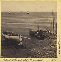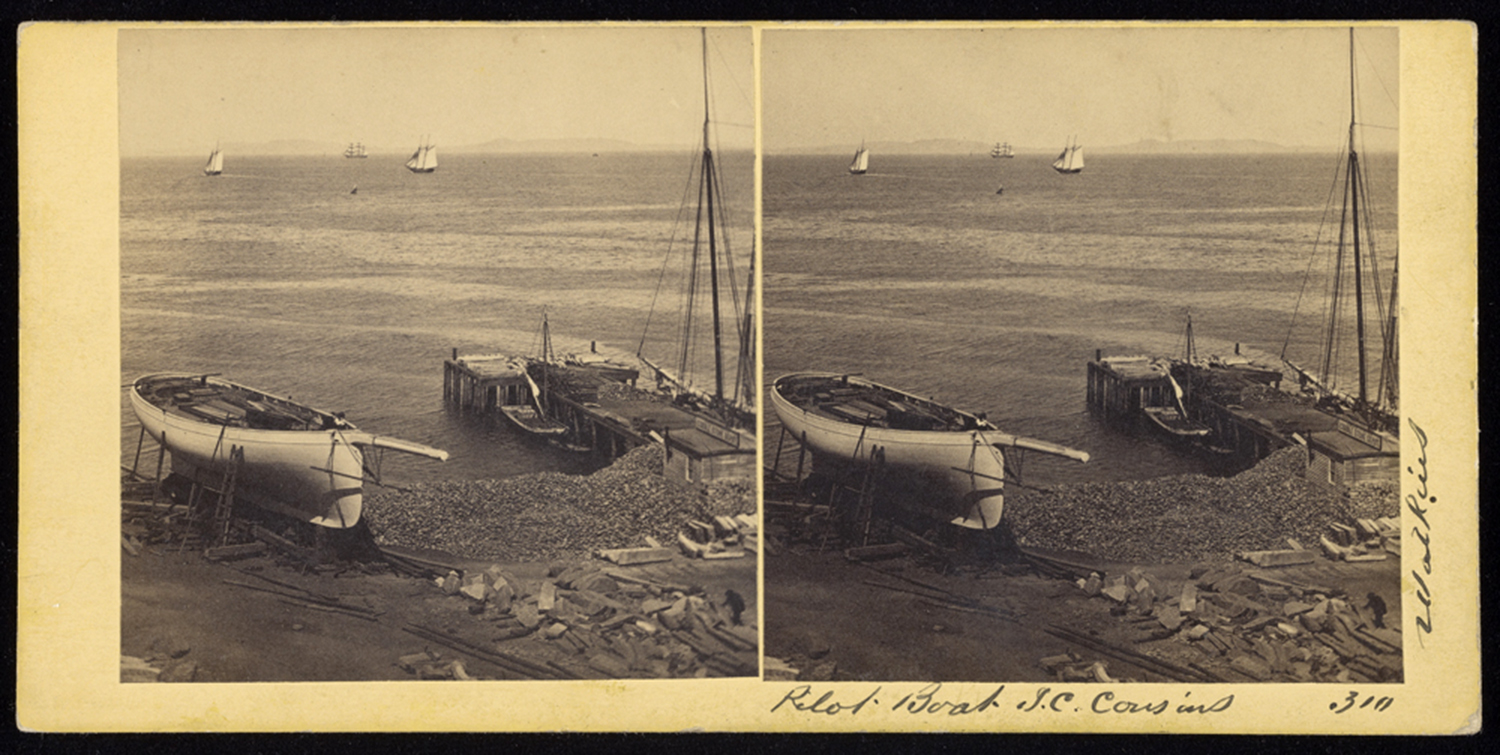 A stereo-viewer slide showing the pilot boat J.C. Cousins hauled up