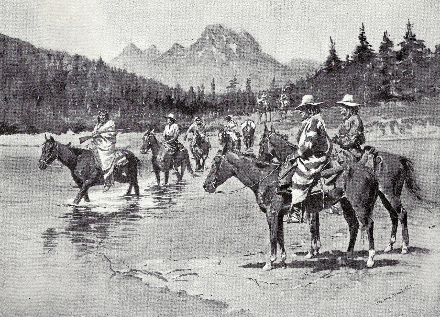 An illustration by Frederic Remington of a Bannock Indian hunting party fording the Snake River, published Aug. 10, 1895, in Harper’s Weekly.
