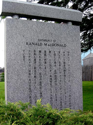 This monument, located at the Fort Astoria park site, denotes the birthplace of Toole-Toole (Ranald MacDonald) there in 1824.