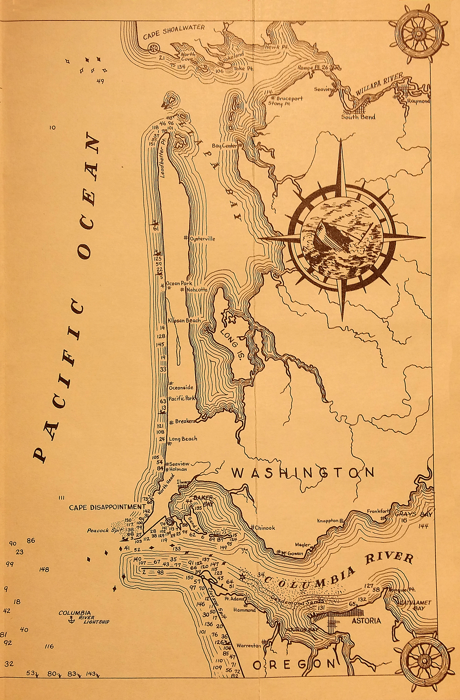 This map of the Columbia River’s entrance, drawn by Harold C. Smith, shows the location of all 151 known shipwrecks of vessels over 25 tons, as of 1950 when the map was published in Gibbs’s book. It doesn’t include incidents in which the vessel involved was merely damaged. (Image: Binfords & Mort Publishers)