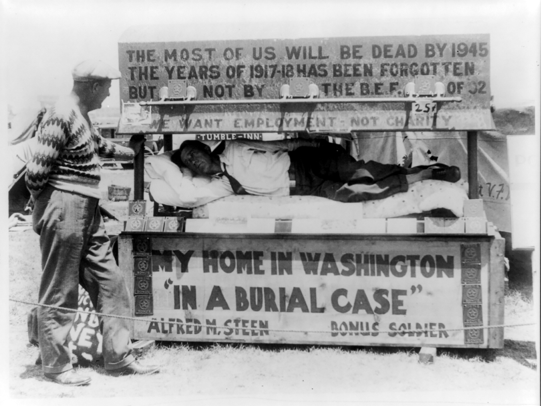 Combat veteran Alfred M. Steen reclines in his “coffin” as part of the Bonus Expeditionary Force protest. (Image: Library of Congress)